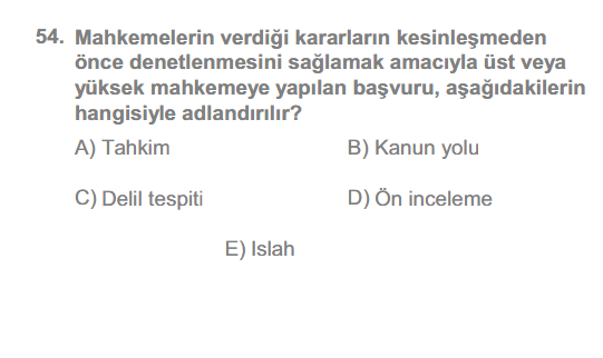 E) Islah54. Mahkemelerin verdiği kararların kesinleşmeden önce denetlenmesini sağlamak amacıyla üst veya yüksek mahkemeye yapılan başvuru, aşağıdakilerin hangisiyle adlandırılır? A) Tahkim C) Delil tespiti B) Kanun yolu D) Ön inceleme E) Islah3 Yorumlar 0 hisse senetleri 78 Views 0 önizleme -