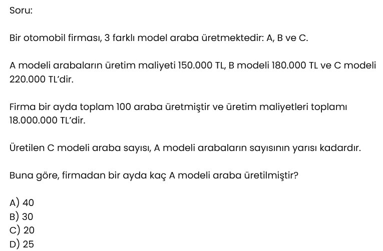 D) 25Soru: Bir otomobil firması, 3 farklı model araba üretmektedir: A, B ve C. A modeli arabaların üretim maliyeti 150.000 TL, B modeli 180.000 TL ve C modeli 220.000 TL’dir. Firma bir ayda toplam 100 araba üretmiştir ve üretim maliyetleri toplamı 18.000.000 TL’dir. Üretilen C modeli araba sayısı, A modeli arabaların sayısının yarısı kadardır. Buna göre, firmadan bir ayda kaç A modeli araba üretilmiştir? A) 40 B) 30 C) 20 D) 25 -